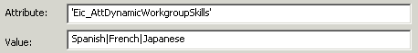 Eic_AttDynamicWorkgroupSkills. Defines a skill set based on two or more defined skills. The skills designated in this attribute must be separated using the pipe-delimited format. For example, if you want to specify that agents assigned to this interaction attribute contain multiple language skills, enter the value for this attribute as “Spanish|French|Norweigian.