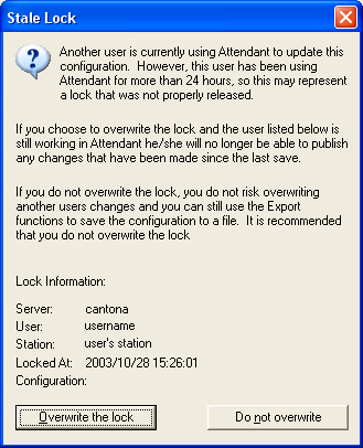 Locks grow stale after Attendant is abnormally terminated by a user (due to a machine crash, etc.) When you overwrite a lock, you can edit and save changes to the server configuration.