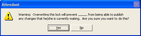 Press Yes to remove the lock. If you press No, you can use Attendant to view and modify the configuration, but it will not allow you to publish changes to the server. To save your edits, you must backup export the your configuration to a disk file, and import it later when the lock has been removed.
