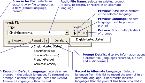 Many property pages in Interaction Attendant contain embedded audio controls. These controls record new prompts, or select a previously recorded prompt to play in an interaction. Use audio controls to import, select, record, or play wave audio files in any needed language. These controls make Attendant easier to use, since frequently used features are implemented consistently throughout the program.