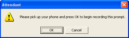 If you are not using SIP or a remote connection, you are prompted by a dialog to pick up your telephone handset. Press OK once your phone is off hook. Then record the new prompt in accordance with the audio instructions that you hear.