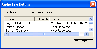 This button opens the Audio File Details dialog, which displays the language, playback duration, and encoding format of the wave audio files for the selected prompt. If the Details button is disabled, you can enable it by choosing a prompt file from the Name combo box.