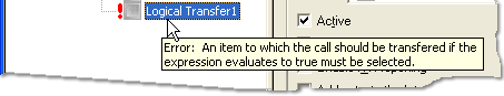 If you hover the mouse cursor over a node that has an error indicator, Interaction Attendant will display a tool tip that describes the error condition.