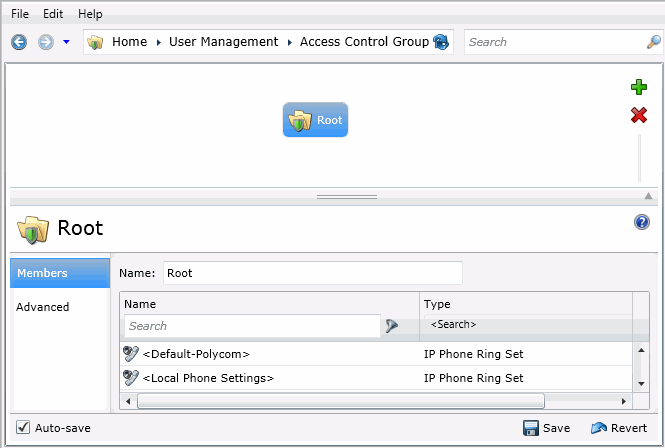 The View Access Control Groups page displays ACGs hierarchy in the master view, and displays details of the currently selected ACG in the details view. You can take actions on the ACGs in the master view, such as edit, delete (not the default root), and you can add a new ACG.