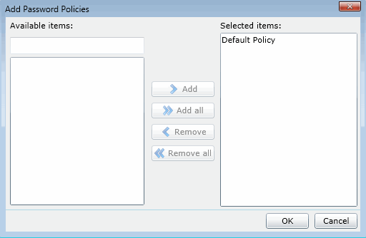 Select one or more Password Policies in the Available items list, and click Add to add the policy(s) to the Selected items list. You can also click Add all to add all policies. To filter the list of policies, type in the filter field above the list.