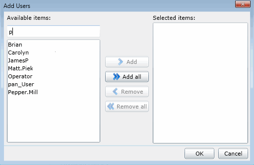 Select one or more users in the Available items list, and click Add to add the user(s) to the Selected items list. You can also click Add all to add all users. To filter the list of users, type in the filter field above the list. -