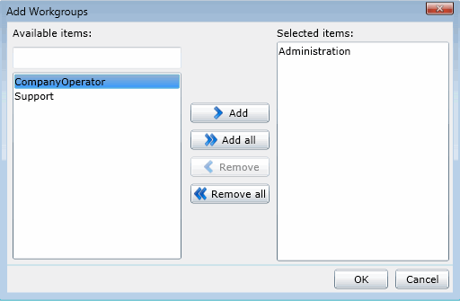 Select one or more Workgroups in the Available items list, and click Add to add the workgroup(s) to the Selected items list. You can also click Add all to add all workgroups. To filter the list of workgroups, type in the filter field above the list. -