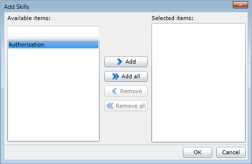 Select one or more skills in the Available items list, and click Add to add the skill(s) to the Selected items list. You can also click Add all to add all skills. To filter the list of skills, type in the filter field above the list. If there are no previously configured skills, there are no entries in list of available items. -