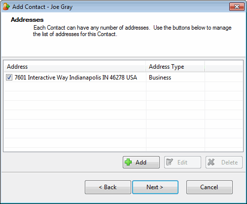 Click Add in the Addresses page and repeat this step for each address you want to add for this contact. After you finish supplying physical addresses for this contact, click Next > and continue to the next step.
