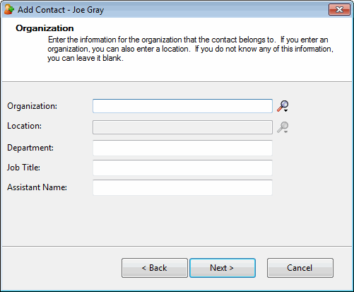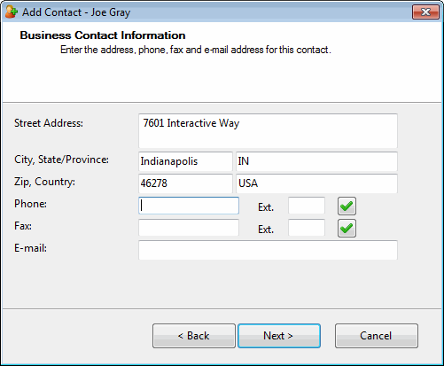 Result: The Business Contact Information page of the Add Contact Wizard appears.