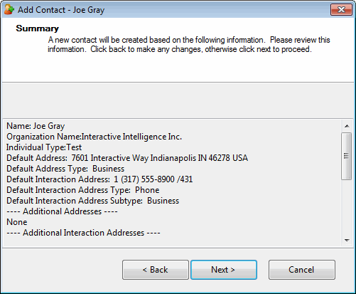 Click Add in the Interaction Addresses page for each iAddress you want to add for this contact. After you finish supplying electronic addresses for this contact, click Next and continue to the next step.