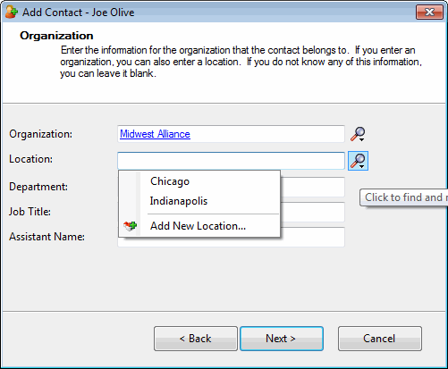 Find a Tracker Contact. In the Search Results page of the Find Contact Wizard, right-click on a contact name and select Properties. In the Properties for Contact dialog box, in the Organization text box, select an Organization. Click the Search control next to the Location text box. From the drop-down list, select Add New Location.