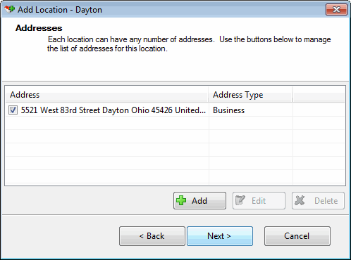 Result: The Addresses page of the Add Location Wizard appears.