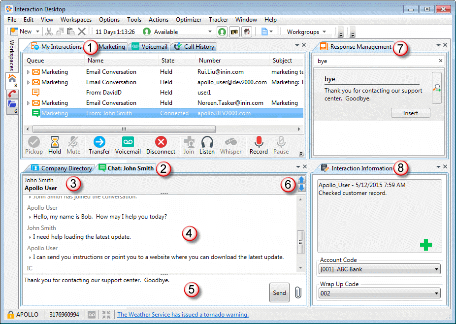 The chat selected in My Interactions determines which chat interaction appears in the Chat View. Tip: To switch quickly from one chat to another in My Interactions, press Ctrl+Up arrow or Ctrl+Down arrow. This makes it easier to participate in more than one chat session at the same time. |