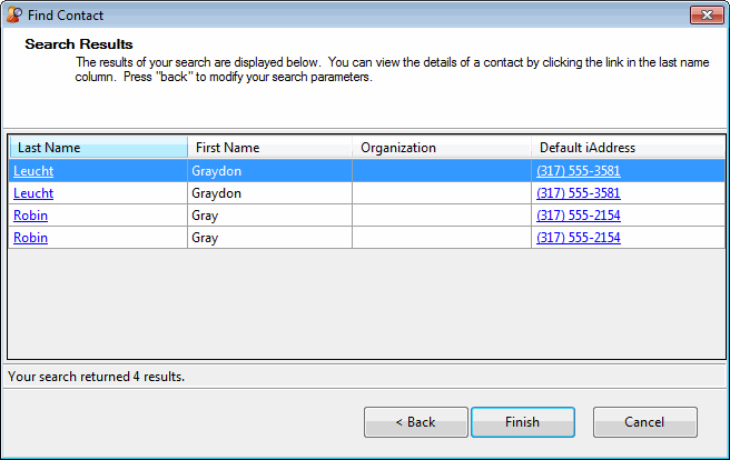 Result: The Search Results page of the Find Contact Wizard appears. It lists all matching contacts.