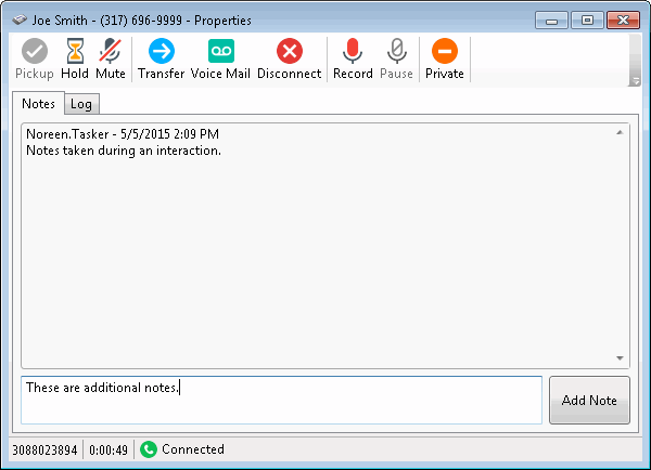 You can access the Interaction Properties dialog box during or just after an interaction; that is before it is removed from My Interactions or other user queue. You can add notes or view the log for the interaction. If you make notes on an interaction in another user’s queue, only that other user can view the notes. Also, if your company uses these codes and you have permission to use these features, you can assign Account Codes or Wrap-Up Codes. For more information, see Working with Account and Wrap-Up Codes.