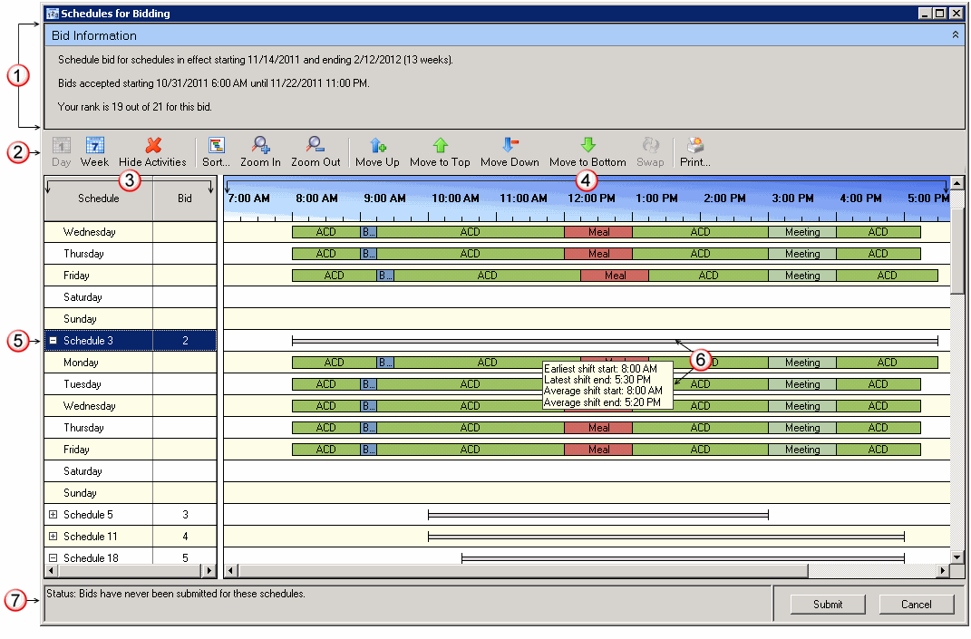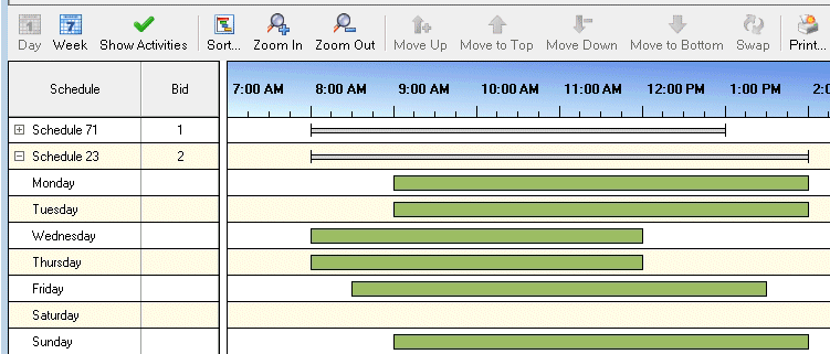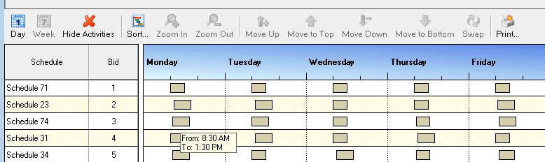 Use the Day and Week tools to control how schedules appear in this part of the Schedules for Bidding window. Switch between a detailed or summary view of each shift in the proposed schedules. Note: The example at the beginning of this topic is the Day view with Activities displayed. Tip: Right-click in this area to display a shortcut menu that enables you to switch views, sort schedules, zoom in or out, print the information currently displayed in the Schedule for Bidding dialog box, and expand or collapse all bid schedules. Also, you can save your preferred view settings by selecting Reuse last saved schedule bid view settings in the Optimizer Settings properties details pane of the Configuration dialog box. For more information, see Optimizer Schedule Bidding Settings. |