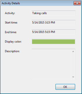 This section displays your currently published schedule. Use the controls in the Schedule toolbar to select a Day, Week, or Month view of your schedule. The time axis in the displayed schedule is automatically adjusted for the daily start and end times you set for your Schedule. Use the scroll bar on the right side of the schedule display to view scheduled activities which occur outside the displayed times |