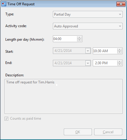 Note: For more information about viewing and managing your time-off requests, see Using the Time Off Request List dialog box.