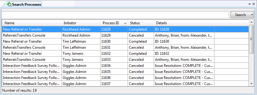 Result: Search results appear in a table in the Search Processes view or Search Processes dialog box.