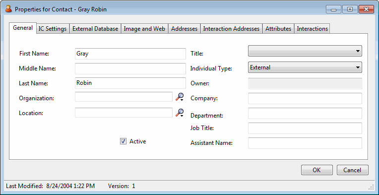 You can change some information on Tracker private and public contacts if you have a Tracker Access License and the Modify Individuals access right or if you are a Tracker administrator. If so, you can modify the Owner, IC User Name, Site Id, Application Id, External Id, and External Source using the Properties for Contact dialog box. For more information about this feature or your right to use it, see your CIC administrator.