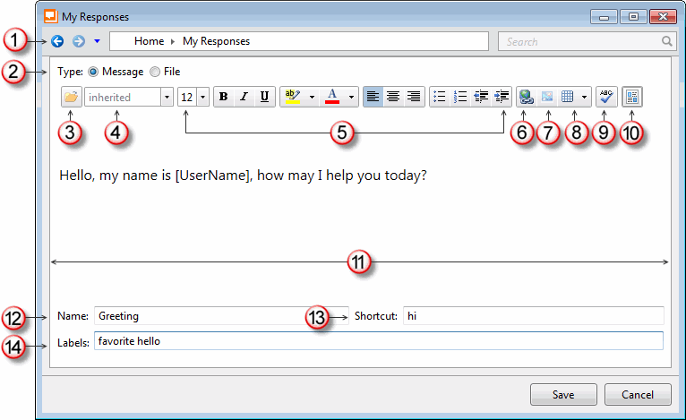 To create and edit response items, use the Response Management Editor. It is a full-featured HTML editor with text formatting tools for messages. You can import HTML files, insert Response Macros, create hyperlinks, and add images.