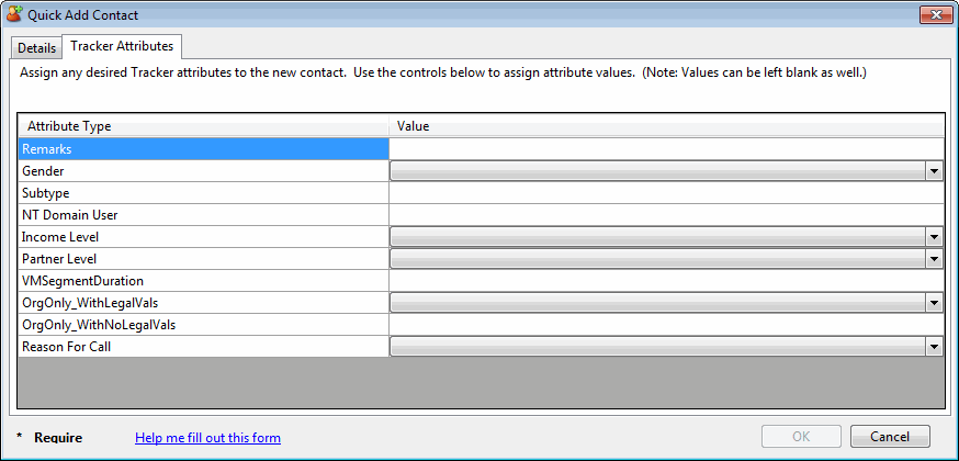 In the Tracker Attributes tab, supply values for the displayed Attribute Types for this contact and click OK.