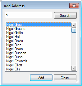 Click the To button. In the Add Address dialog box, type all or part of the address in the text box and click Search. From the results list, select the appropriate address and click Add.
