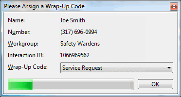 Note: If a supervisor assigns a Wrap-Up code for the interaction while the Wrap-Up code prompt is being displayed, the newly selected code appears in the Wrap-Up Code drop-down list. You cannot change this code from the prompt. However, you can change it, if needed, in the Interaction Information view. You can then close the Please Assign a Wrap-Up Code dialog box or wait for the dialog box to close automatically when the Wrap-Up time limit is reached.