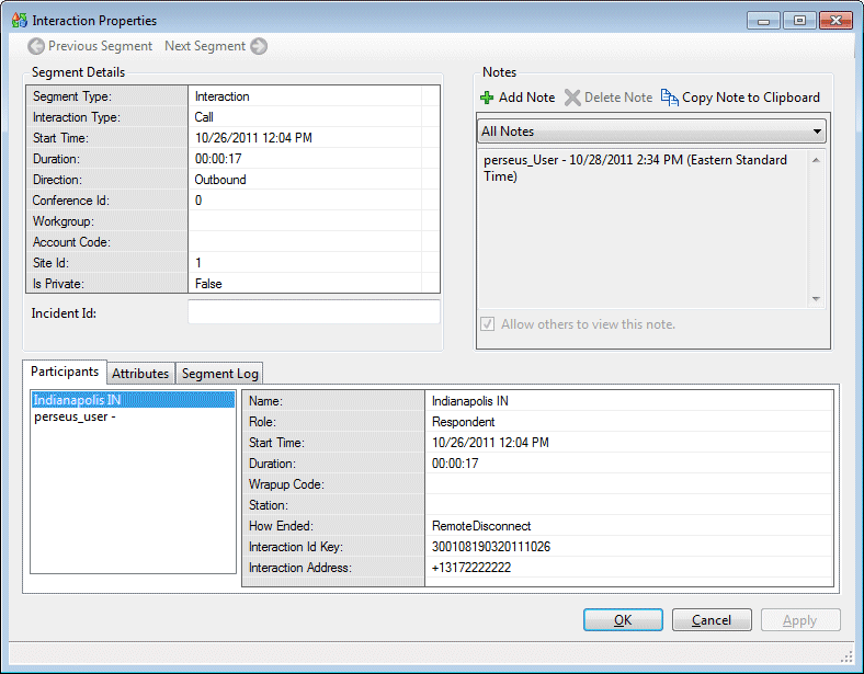 Note: You can add, edit, or delete some of the information in the Interaction Properties dialog box. In particular, you can work with Notes and Attributes information. For more information, see Use Interaction Notes and Assign Interaction Tracker Attributes.