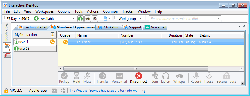 For example, receptionists or assistants can use Monitored appearances to continuously observe a manager’s queue, control interactions, and perform tasks on the manager’s behalf, such as picking up or transferring calls and creating conferences.