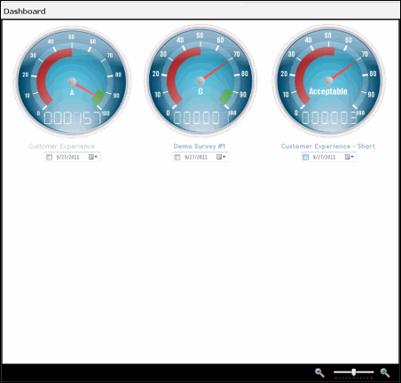 Use the Manage Dashboard toolbar button to add individual survey results to the Dashboard. Results are graphically displayed as a speedometer.
