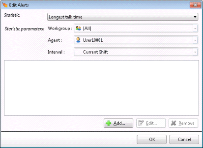 3. Fill in statistic parameters as needed. The appearance of the Add/Edit Alert dialog varies, since statistics use parameters to quantify what the statistic displays information about. For example, a statistic for Longest Talk Time has three parameters: workgroup, agent, and period interval (such as current shift). In this case, parameters scope the Longest Talk Time statistic to a particular agent, workgroup queue, and time frame. Other statistics require different parameters.