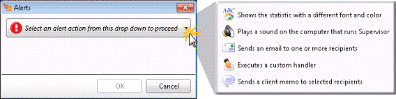 Configuring Interaction Supervisor to set an alert provides notification when a particular metric enters, is within bounds, or is no longer within a user-defined range of values.  Alerts can be displayed in Supervisor using color coded icons and text attributes to highlight a metric. Alerts can optionally send email notifications, play sounds, or invoke a handler.