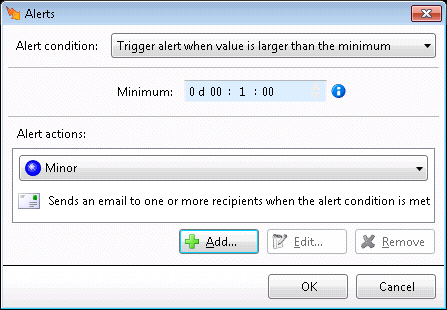 3. Optionally repeat steps 5-8 to add additional alert conditions and actions. This makes it possible to create an alert that performs more than one action. Actions are listed in the Alert actions pane of the Edit Alerts dialog.