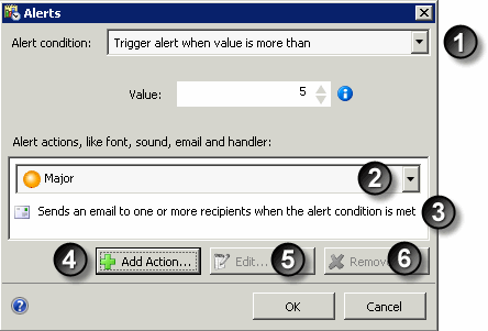 Optionally adds an action for the alert to perform when triggered. This opens the Add/Edit Alert Action dialog.