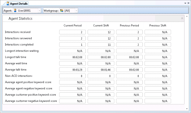 The Agent Details view summarizes the activity of a single agent, for a single workgroup, or for all workgroups that the agent has membership in. This view displays Agent Statistics for the current period, previous period, current shift and previous shift, in a single expander control.