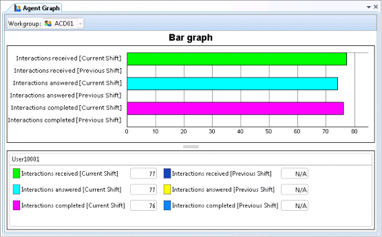 The Agent Graph view shows statistics of several agents in one or more workgroups presented in a graph. This view charts Agent Statistics for your choice of intervals (current period, previous period, current shift and previous shift).