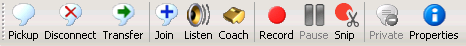 Each button in the Call Action Control toolbar performs a telephony action on selections in the currently displayed queue. If an action cannot be performed, its button appears shaded. Whether or not a toolbar action is available is controlled by the Security and ACL rights configured in Interaction Administrator.