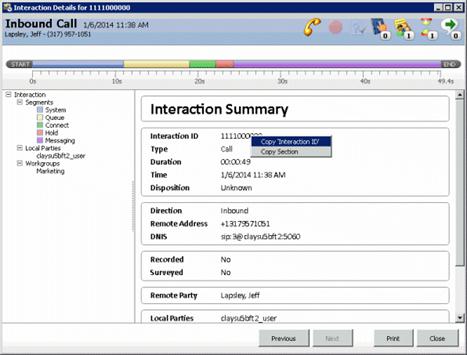If you double-click a row in the search result to open the Interaction Details window, all sections and fields in the summary panel (right hand side) can be copied. For any given item, two options: "Copy [name of field]" and "Copy Section"