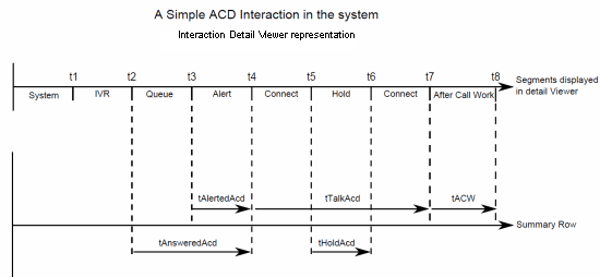 When there are multiple interactions, then the stats related to them are summarized according to their workgroup, media type, and report group. To co-relate them, it would be necessary to find corresponding Interaction Detail Viewer segments. The purpose of the above diagram is not to compare the Interaction detail viewer segment with IWrkGroup Queue statistics. Instead, it is to explain how the statistic collection is mapped between the two data collection modules.