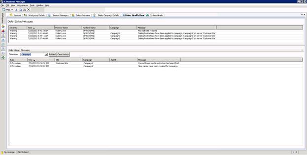 The Dialer Health view displays the health and status of campaigns and Interaction Dialer in general. Use this view to troubleshoot issues. It presents two panes of information: