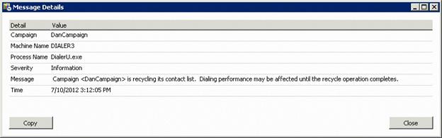 The bottom pane (Dialer History) lists event and status messages that were logged by the Central Campaign Server, Outbound Dialer Servers, and by internal processes such as DialerTran. Since Dialer consolidates messages in its own message history, it is convenient to examine this repository for Dialer-related entries. When the view is scoped to view multiple workflows, the messages for each workflow are grouped together (in other words, messages for workflow A and workflow B are not intermixed). When the dialog is scoped to monitor a single workflow, only messages from that workflow appear in the list.