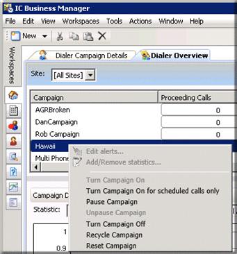 The Dialer overview displays important campaign statistics at the top of the screen. You can control campaign execution directly from this pane in the Dialer Overview. Select a row in the top pane for a campaign. Then right-click to display a context menu. See Campaign Execution Control for more information. The graph pane displays Dialer stage statistics for a time interval (period, shift, cycle, campaign) and agent(s) selected. The pane in the lower right displays Dialer agent statistics, such as the call stage each agent is currently in. Use it compares the performance of multiple agents across sites and campaigns in a workflow. It can display the current activity of agents, such as each agent's current status, current stage, time in status, and time in stage. The Interaction Supervisor Help for IC Business Manager explains how to work with views and alerts. To open this help system in IC Business Manager, select Interaction Supervisor from the Help menu. |