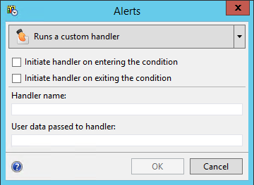 This dialog configures an alert to execute a handler when the alert condition is entered, exited, when statistics change within the range of the condition, or when someone reconfigures the alert itself. Use the StatAlertServer initiator to define the custom handler. For more information about the StatAlertServer initiator, see Designer help in the PureConnect Documentation Library.