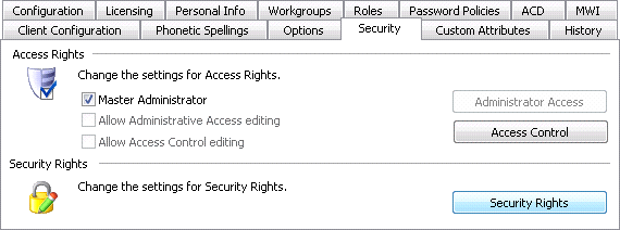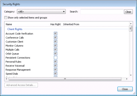 Security rights manage the functionality offered by client applications, such as buttons for recording, listening, and coaching.