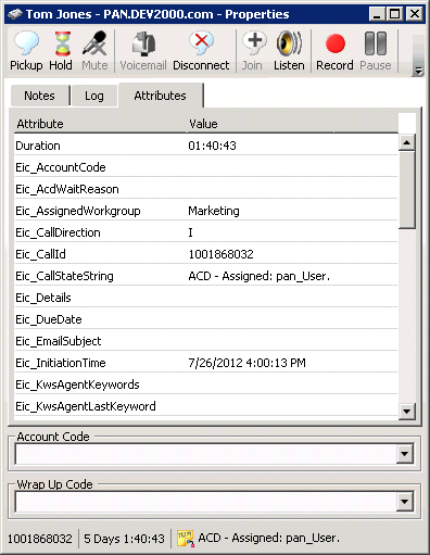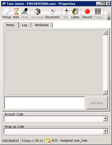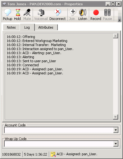 The Interaction Properties dialog is often used to add notes to an interaction or to view an interaction's log. It is also used to assign account codes and wrap-up codes to interactions.