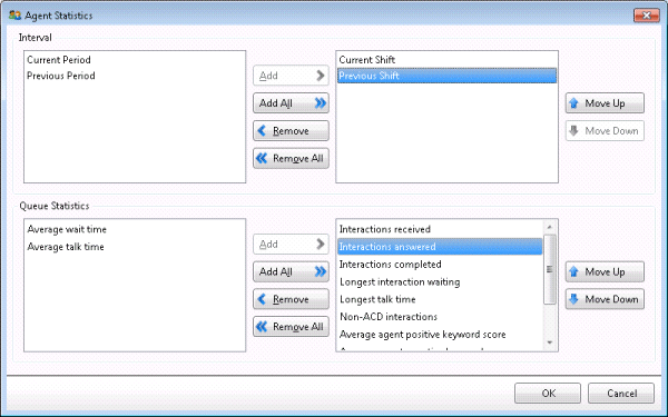 Options in this frame manage statistics to report in the view. The list on the left contains items that are not currently included in the view. The list on the right contains items selected to include in the view. Select items in the list on the left. Then click Add to move them to the other list, to include them in the view. Add All selects all items for inclusion. You can change the display order of rows in the view using Move Up and Move Down buttons. To exclude statistics from the view, select items in the list on the right. Then click Remove. The Remove All button excludes all statistics from the view, but at least one has to be included.