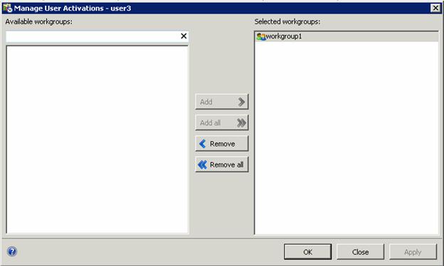 To activate the user's participation in a workgroup, select workgroup(s) in the Available workgroups list. You can Ctrl-click to select multiple entries. Then Click Add. You can optionally click Add All to activate the user on all available workgroups.