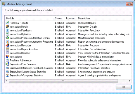 The Module Management dialog appears when Module Management is selected from this Tools menu. This dialog lists installed application modules, whether they are enabled, and whether a license has been acquired allowing usage. See Licenses, Security and Access Control Rights for more information.